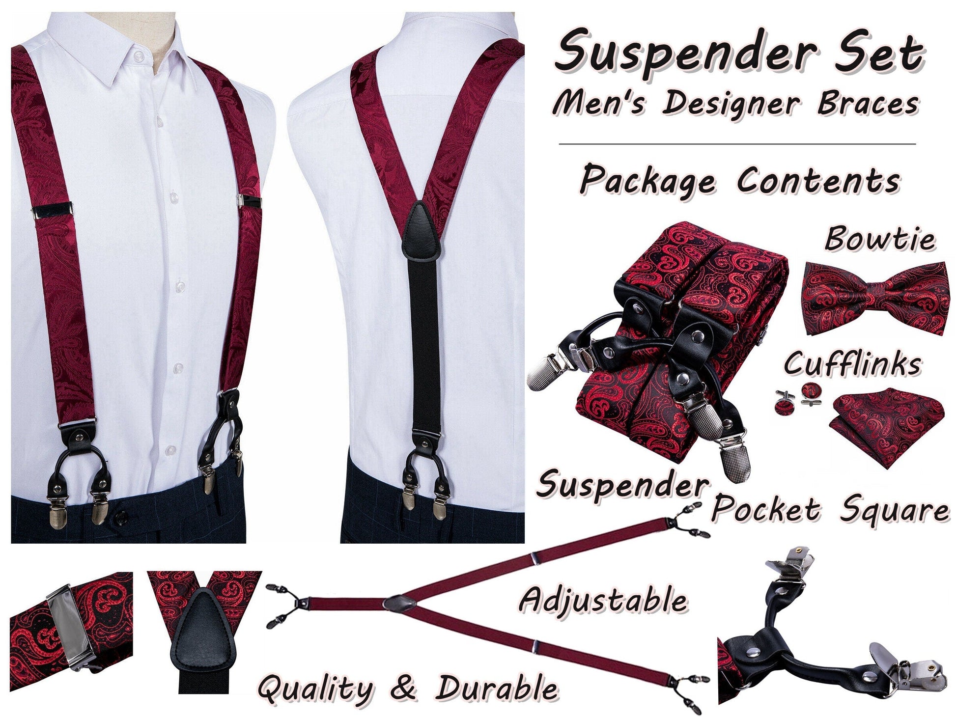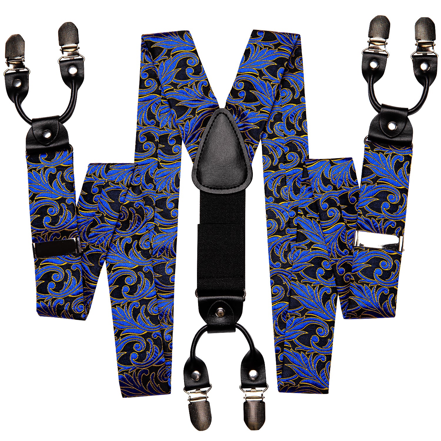 Typical Y Shape design joint by faux leather pieces with 6 clips of metallic shell & rubber teeth that hold your trousers all day long, easy to wear with adjustable braces to fit all body specs,
