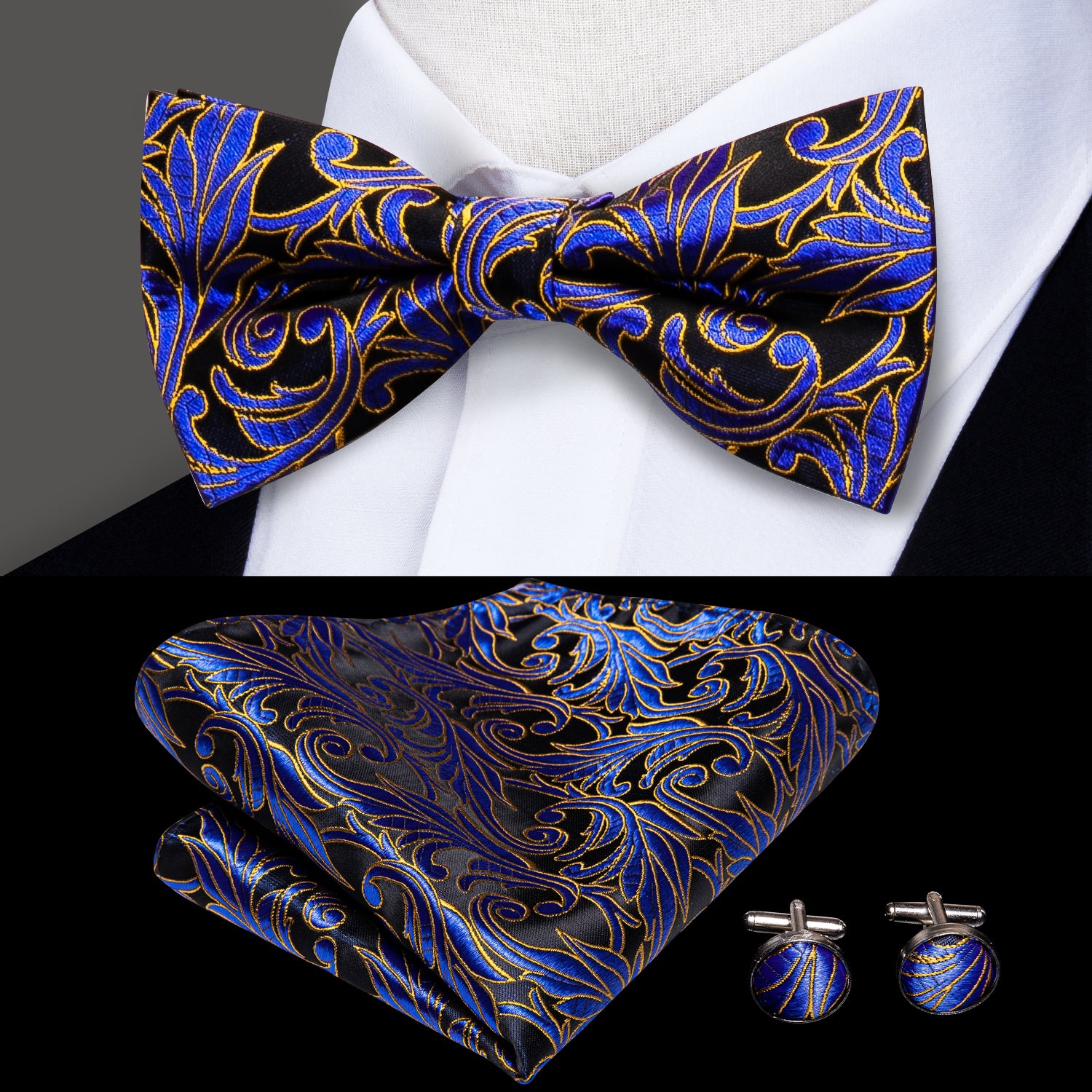 Well finished with Silky microfabric in bright Floral designs offering a festive look, companied by Bowtie and Pocket Square of the same print, and don't forget the cufflinks for your French Shirt,