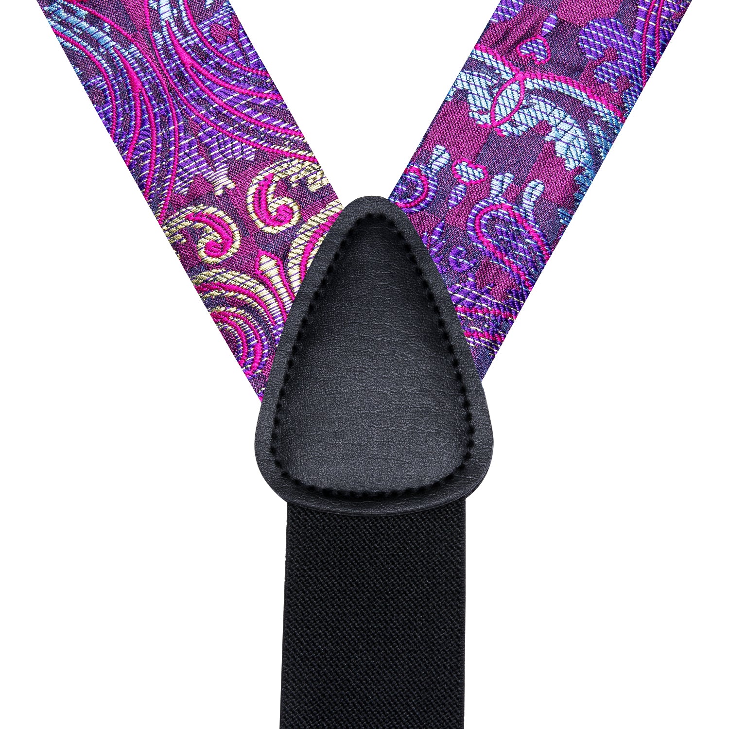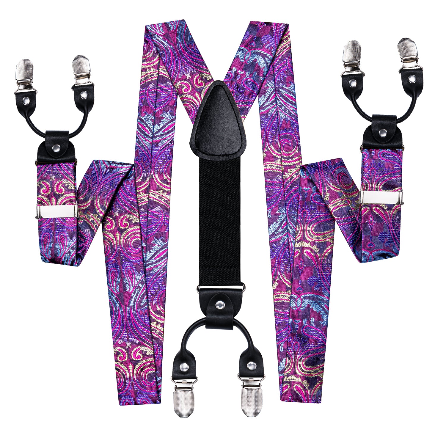 Typical Y Shape design joint by faux leather pieces with 6 clips of metallic shell & rubber teeth that hold your trousers all day long, easy to wear with adjustable braces to fit all body specs,