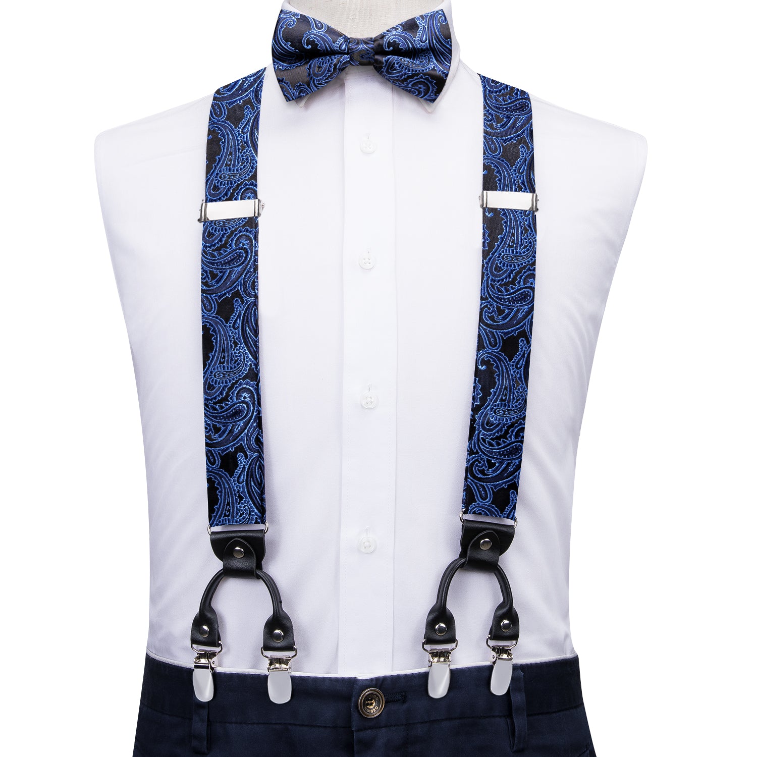 Typical Y Shape design joint by faux leather pieces with 6 clips of metallic shell & rubber teeth that hold your trousers all day long, easy to wear with adjustable braces to fit all body specs,