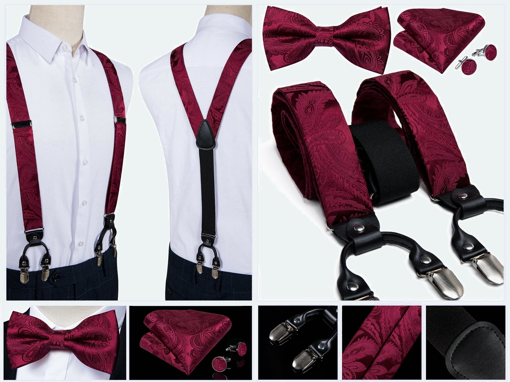 Typical Y Shape design joint by faux leather pieces with 6 clips of metallic shell & rubber teeth that hold your trousers all day long, easy to wear with adjustable braces to fit all body specs,